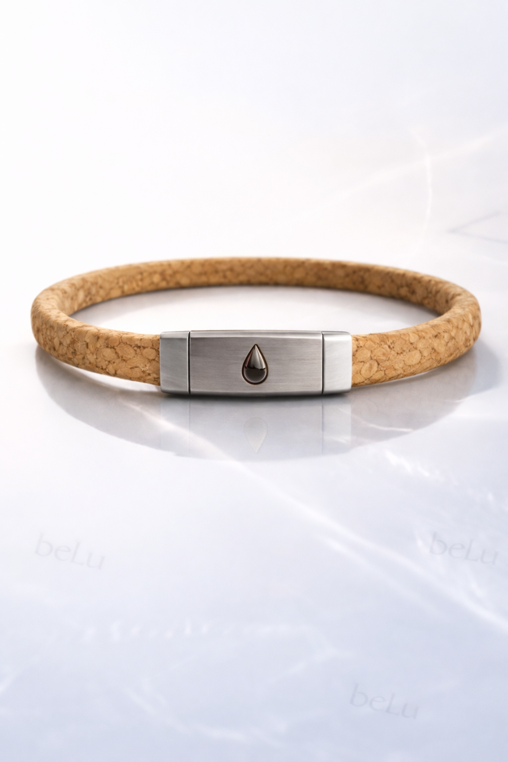 Der Kork schmiegt sich leicht an das Handgelenk, der Tropfen ist mit Rauchquarz gefüllt und wirkt ruhig und geschlossen.